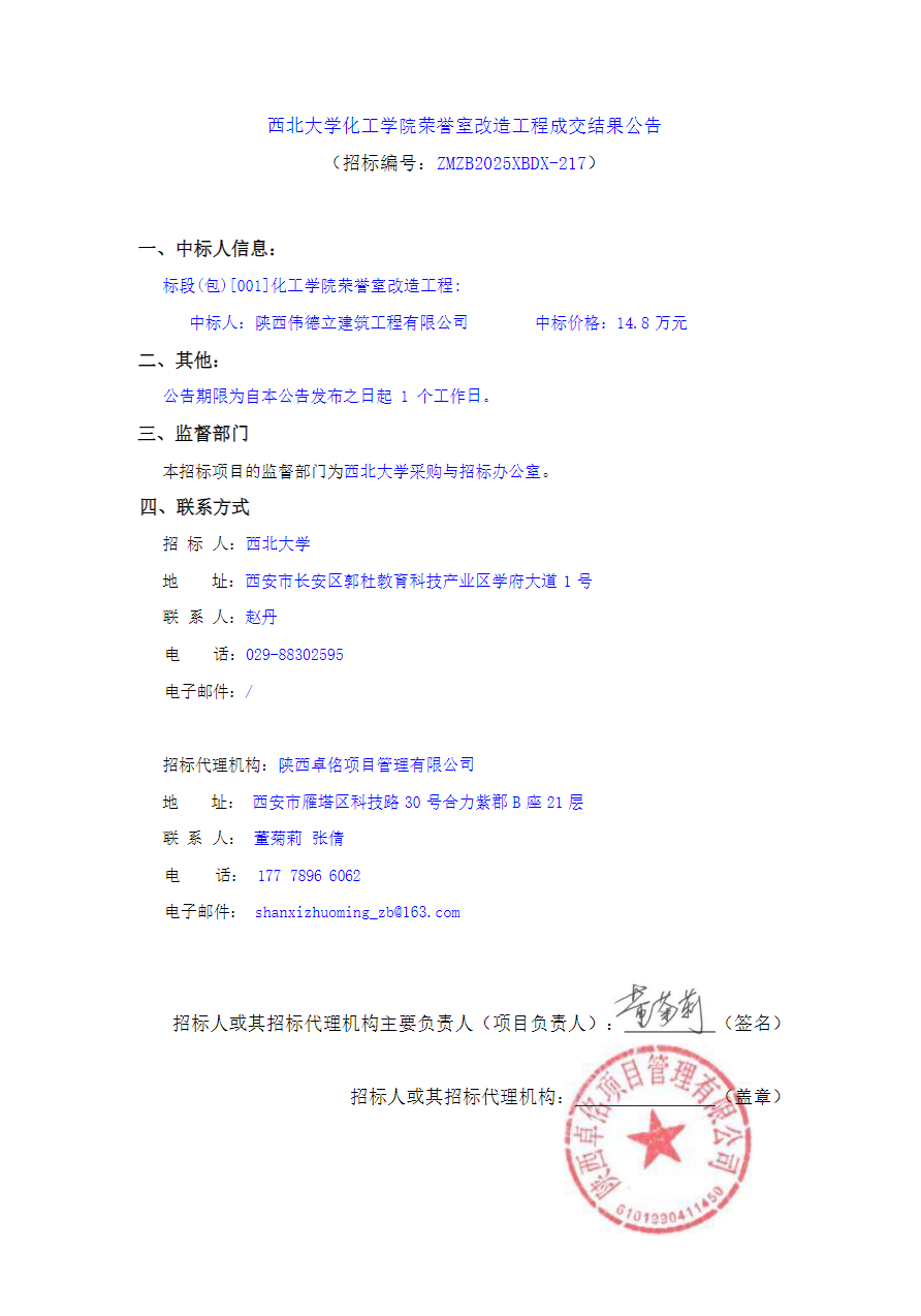 天空(中国)化工学院荣誉室改造工程成交结果公告