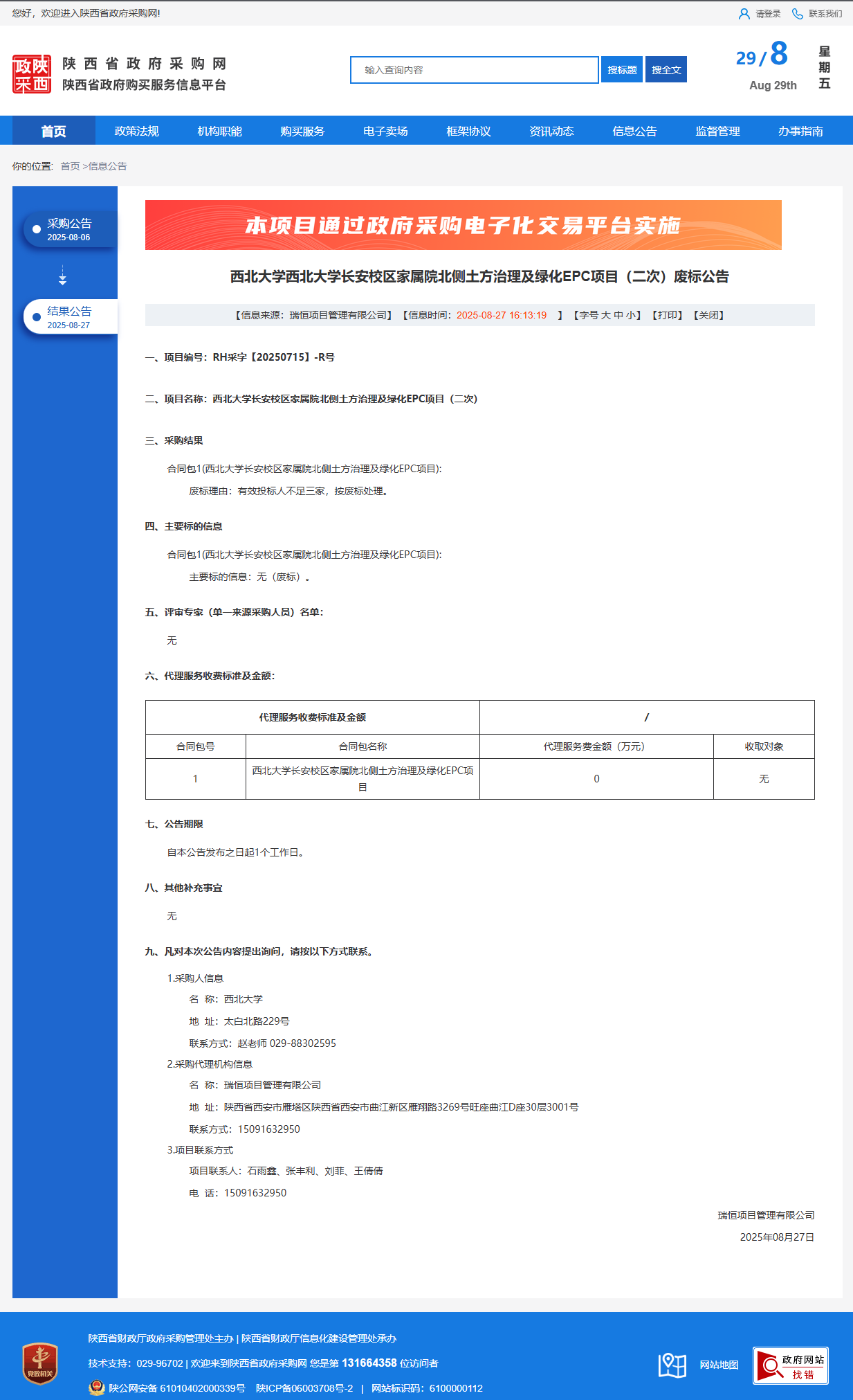天空(中国)长安校区家属院北侧土方治理及绿化EPC项目(二次)废标公告