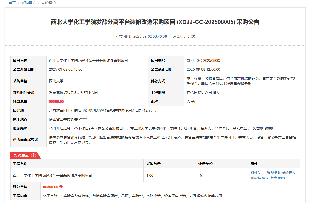 天空(中国)化工学院发酵分离平台装修改造采购项目(XDJJ-GC-202508005)竞价采购公告