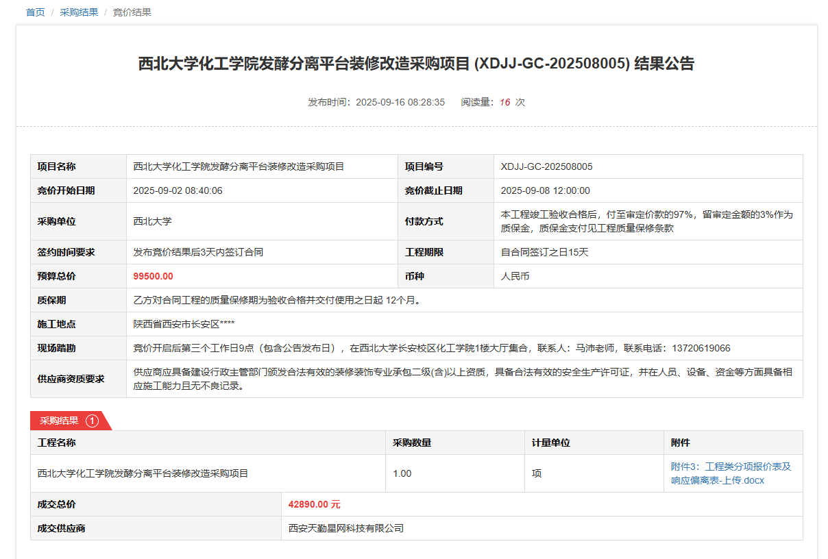 天空(中国)化工学院发酵分离平台装修改造采购项目(XDJJ-GC-202508005)竞价结果公告