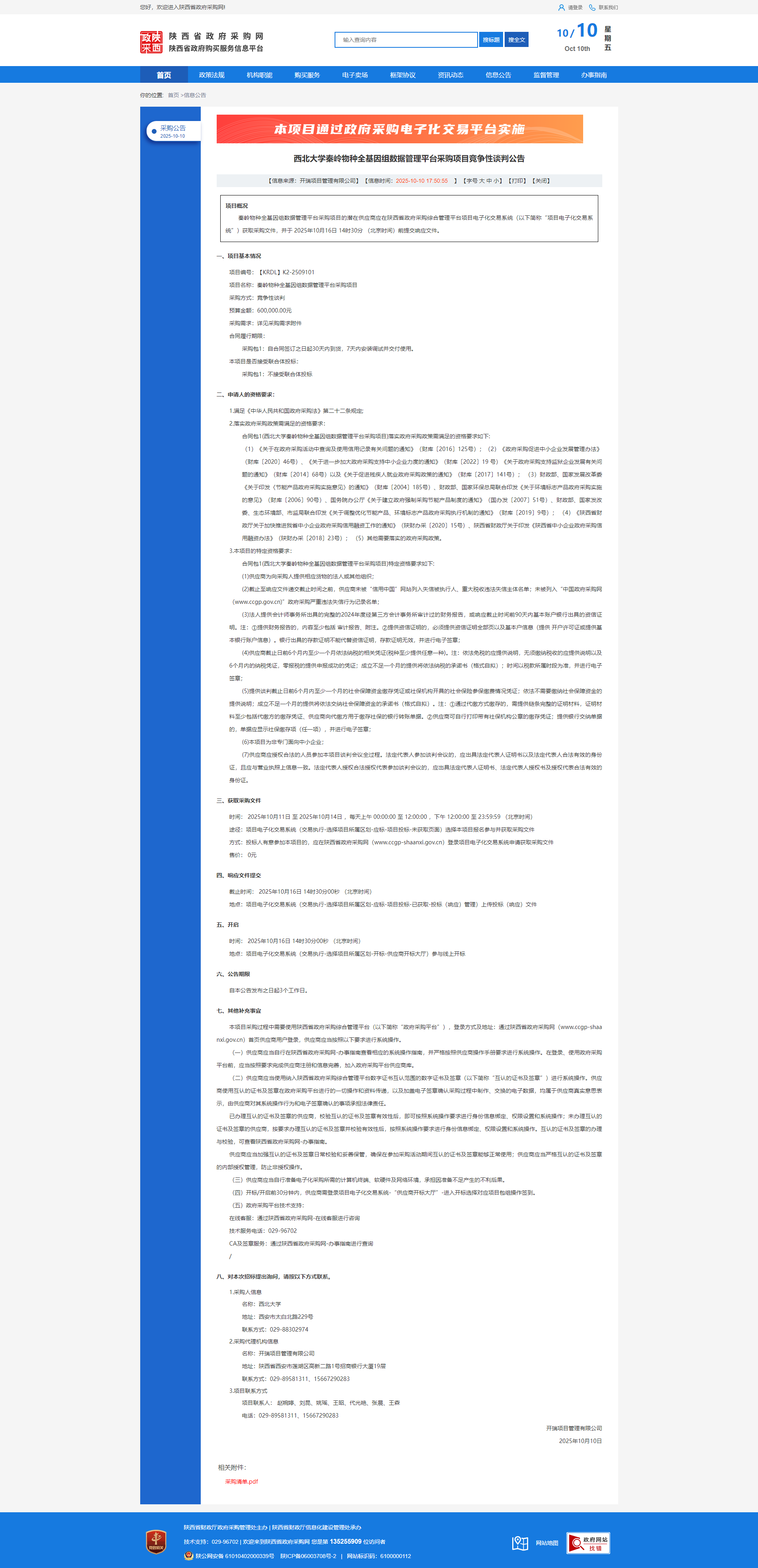 天空(中国)秦岭物种全基因组数据管理平台采购项目竞争性谈判公告