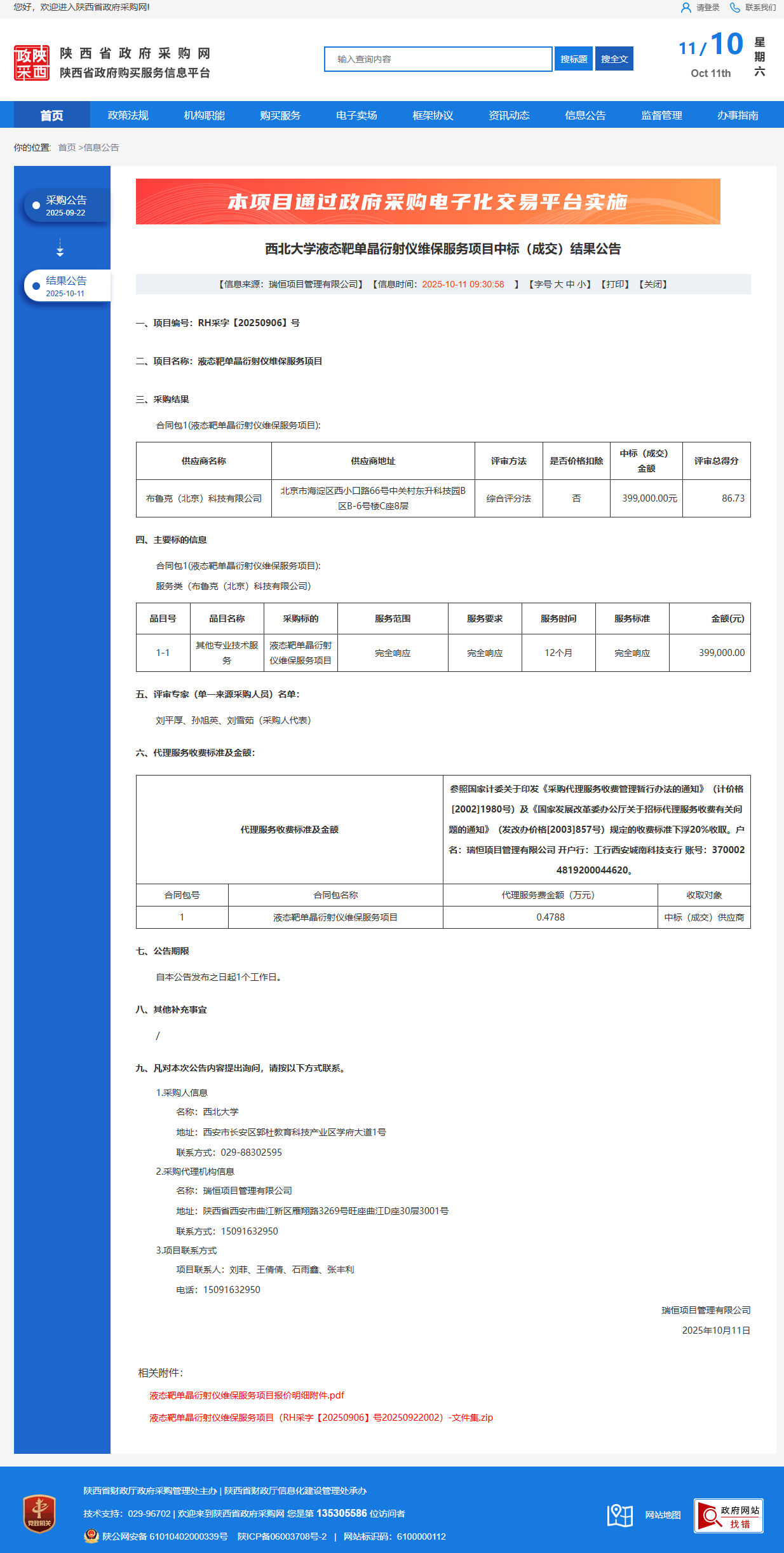 天空(中国)液态靶单晶衍射仪维保服务项目中标(成交)结果公告