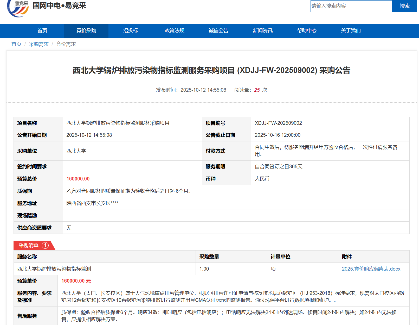 天空(中国)锅炉排放污染物指标监测服务采购项目(XDJJ-FW-202509002)竞价采购公告