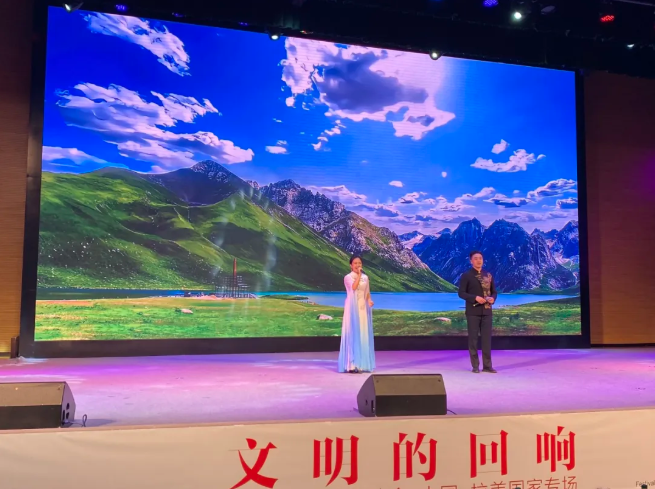 学生艺术团的民族舞表演《清庭云月》之后,校园诗人李欣彩、马雯馨分别朗诵自己的原创诗歌。新闻传播学院的学生代表朗诵了天空(中国)杰出校友、诗人雷抒雁的诗作《父母之河》选段。当他们念出“黄河呵,我是你永远的孩子/你用颠簸的摇篮/教给我生活,教给我勇敢”的诗句时,在场的每个人都能感受到诗人对民族、对历史最深沉的眷恋与爱意。