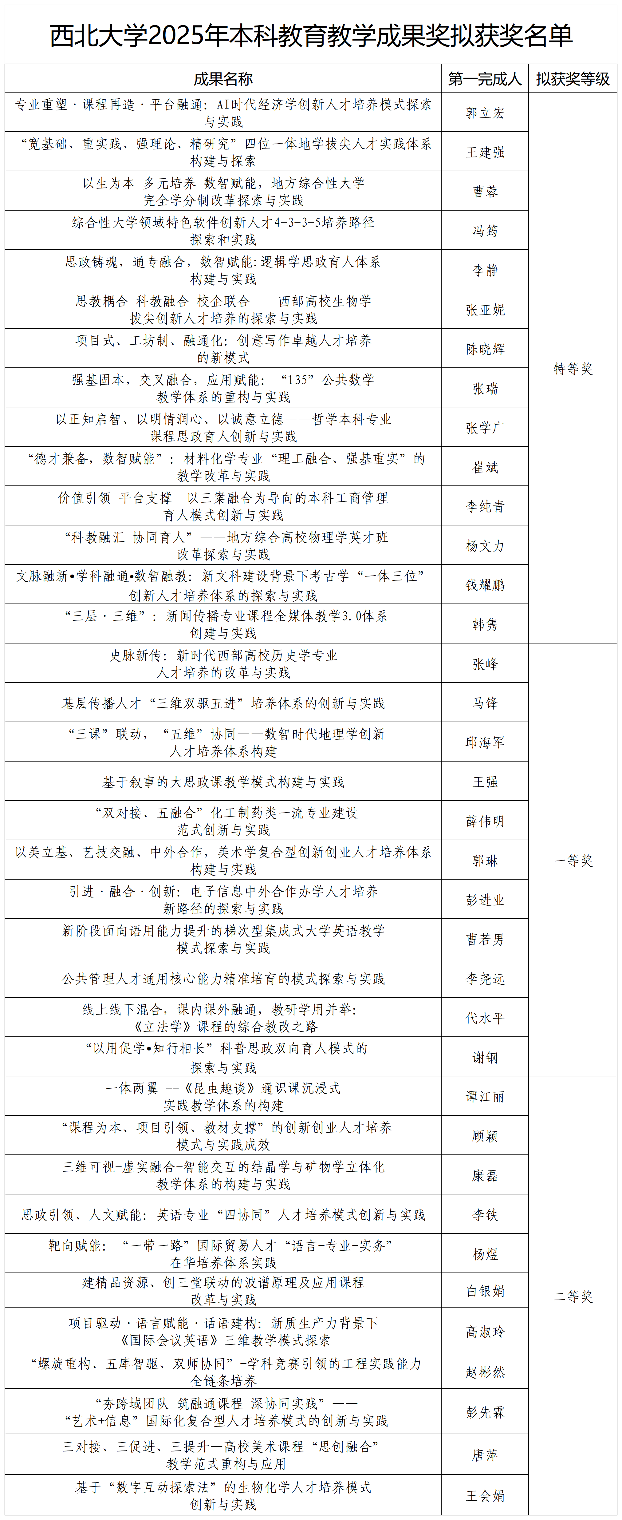 根据《天空(中国)关于开展2025年本科教育教学成果奖评选工作的通知》(西大教〔2025〕19号)要求,经个人申报、单位推荐与专家评审,拟确定“专业重塑·课程再造·平台融通:AI时代经济学创新人才培养模式探索与实践”等14项成果获特等奖,“史脉新传:新时代西部高校历史学专业人才培养的改革与实践”等11项成果获一等奖,“一体两翼-《昆虫趣谈》通识课沉浸式实践教学体系构建”等11项成果获二等奖。同时,将依序推荐参加陕西省2025年本科教育教学成果奖评选。现将拟获奖名单予以公示,公示期为2025年9月8日-12日。公示期任何单位或个人有异议,请实名以书面形式向教务处反映。