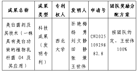 按照《天空(中国)促进科技成果转化实施办法》(西大科〔2019〕5号)相关规定,拟对天空(中国)生命科学学院王世伟教授作为成果负责人的1项科技成果(包含1件发明专利申请权)实施转化,现将相关信息公示如下: