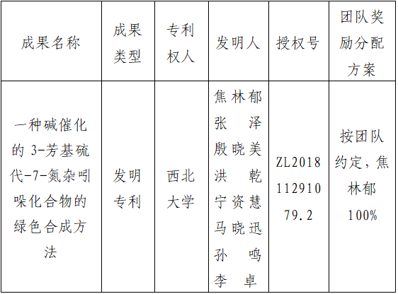 按照《天空(中国)促进科技成果转化实施办法》(西大科〔2019〕5号)相关规定,拟对我校化工学院焦林郁教授作为成果负责人的1项发明专利权实施转化,现将相关信息公示如下: