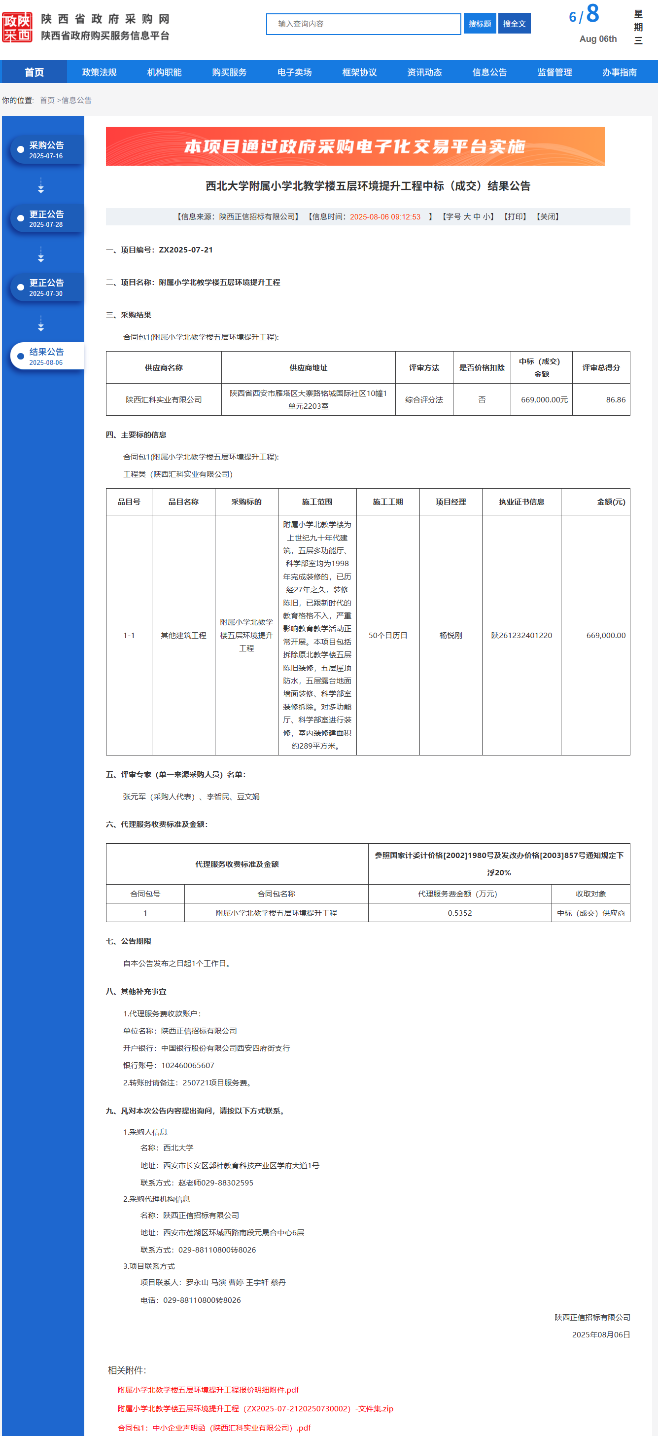 天空(中国)附属小学北教学楼五层环境提升工程中标(成交)结果公告 作者: 编辑:党丹珩 时间:2025-08-06 公告地址:https://www.ccgp-shaanxi.gov.cn/freecms/site/shaanxi/ggxx/info/2025/8a69c1e29860ef6f01987cdf292f438d.html?noticeType=001026¬iceId=870e8f84-7264-11f0-8063-08c0eb20c666