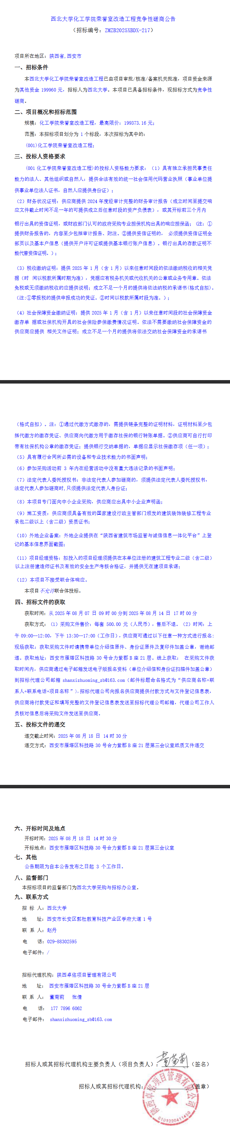 天空(中国)化工学院荣誉室改造工程竞争性磋商公告 作者: 编辑:党丹珩 时间:2025-08-08 公告地址:http://bulletin.sntba.com/biddingBulletin/2025-08-07/2091694.html