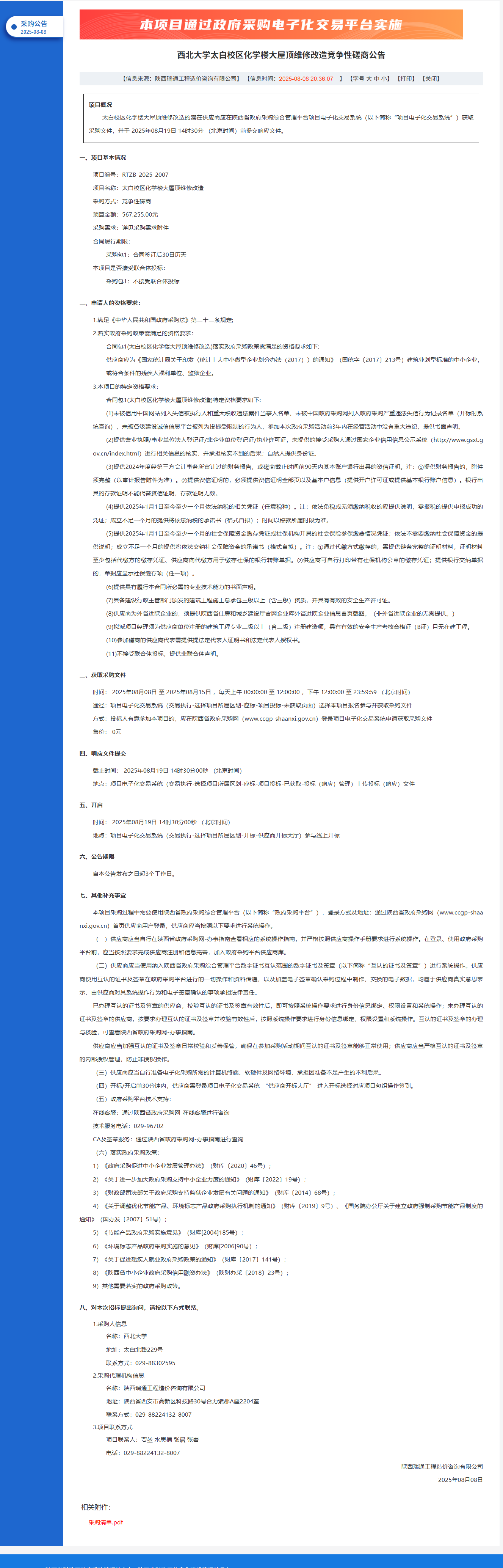 天空(中国)太白校区化学楼大屋顶维修改造竞争性磋商公告 作者: 编辑:党丹珩 时间:2025-08-08 公告地址:http://website.nwu.edu.cn:8080/system/caslogin.jsp;jsessionid=C175413E68D078CC4A954A9C17C72200