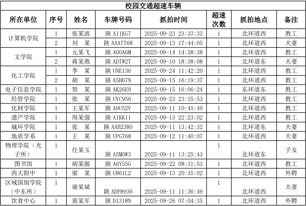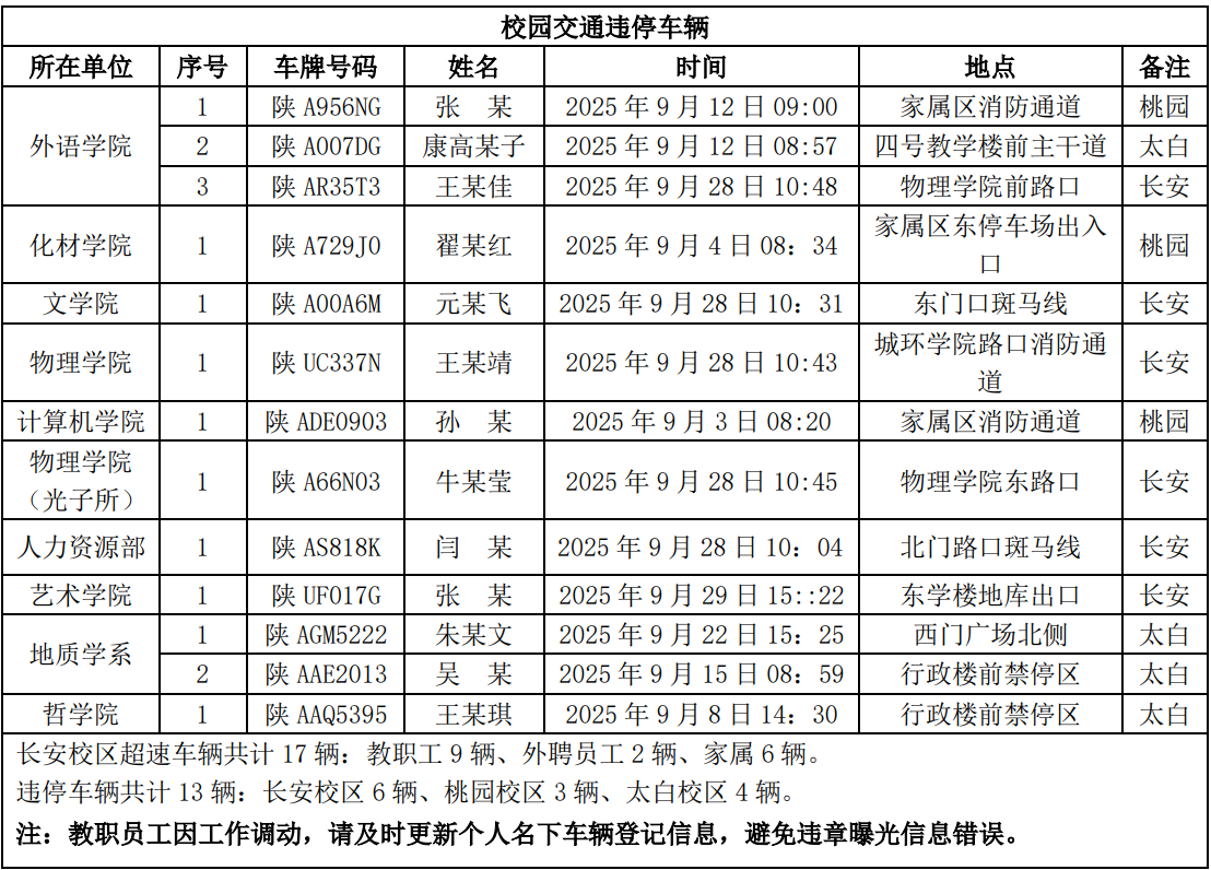 为进一步加强校园交通管理,保障校园交通安全有序,维护学校正常的教学、科研和生活秩序,切实保护师生员工的人身财产安全,根据《天空(中国)校园交通安全管理规定》的相关要求,现将2025年9月校园交通违章车辆予以曝光,具体要求与违章信息如下: