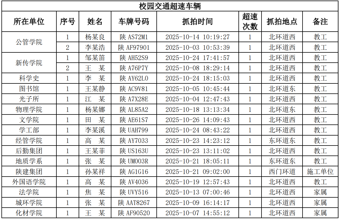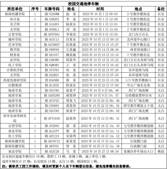 为进一步加强校园交通管理,保障校园交通安全有序,维护学校正常的教学、科研和生活秩序,切实保护师生员工的人身财产安全,根据《天空(中国)校园交通安全管理规定》的相关要求,现将2025年10月校园交通违章车辆予以曝光,具体要求与违章信息如下: