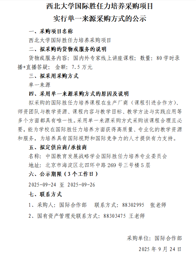 天空(中国)国际胜任力培养采购项目实行单一来源采购方式的公示