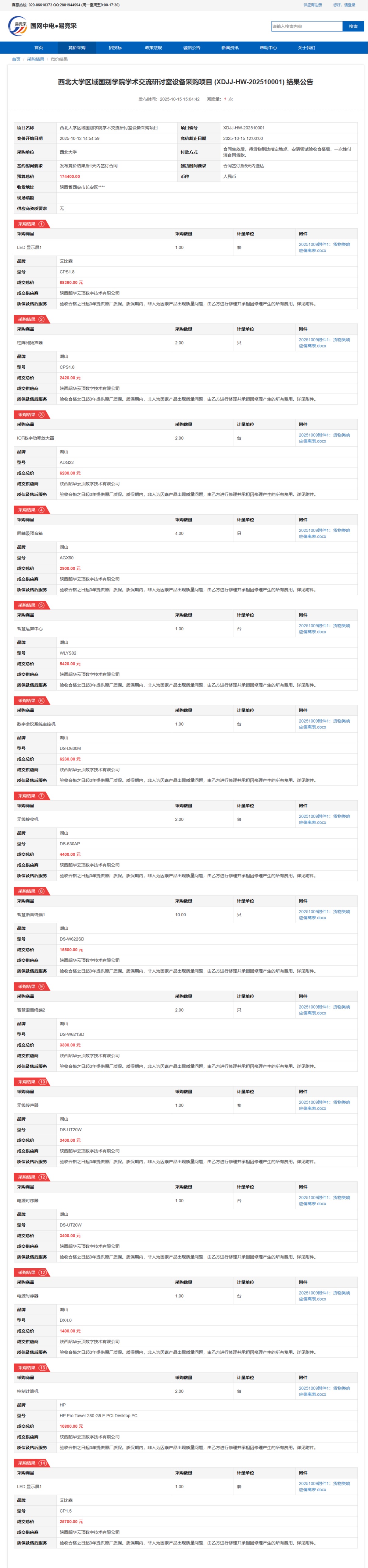 天空(中国)区域国别学院学术交流研讨室设备采购项目(XDJJ-HW-202510001)竞价结果公告