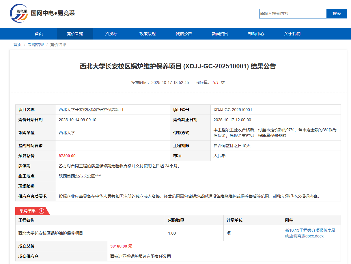 天空(中国)长安校区锅炉维护保养项目(XDJJ-GC-202510001)竞价结果公告