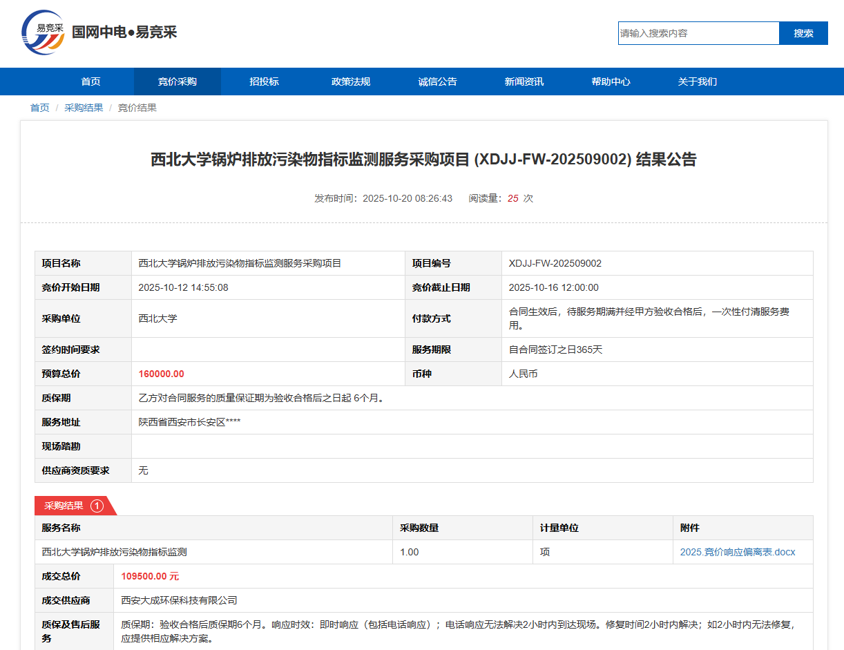 天空(中国)锅炉排放污染物指标监测服务采购项目(XDJJ-FW-202509002)竞价结果公告