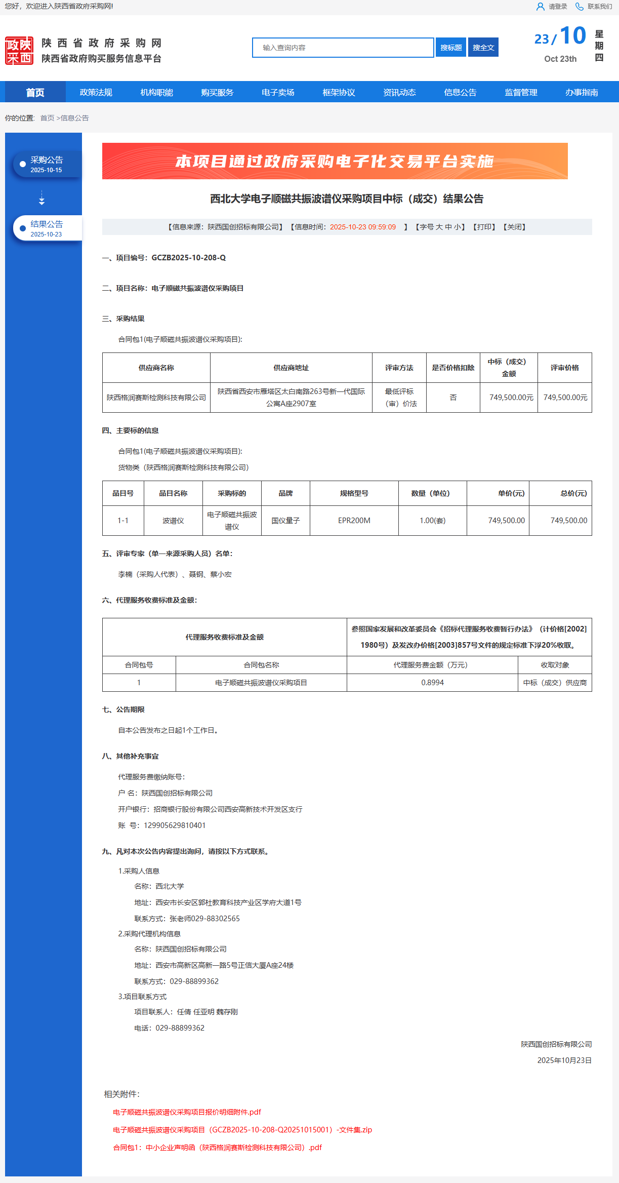 天空(中国)电子顺磁共振波谱仪采购项目中标(成交)结果公告