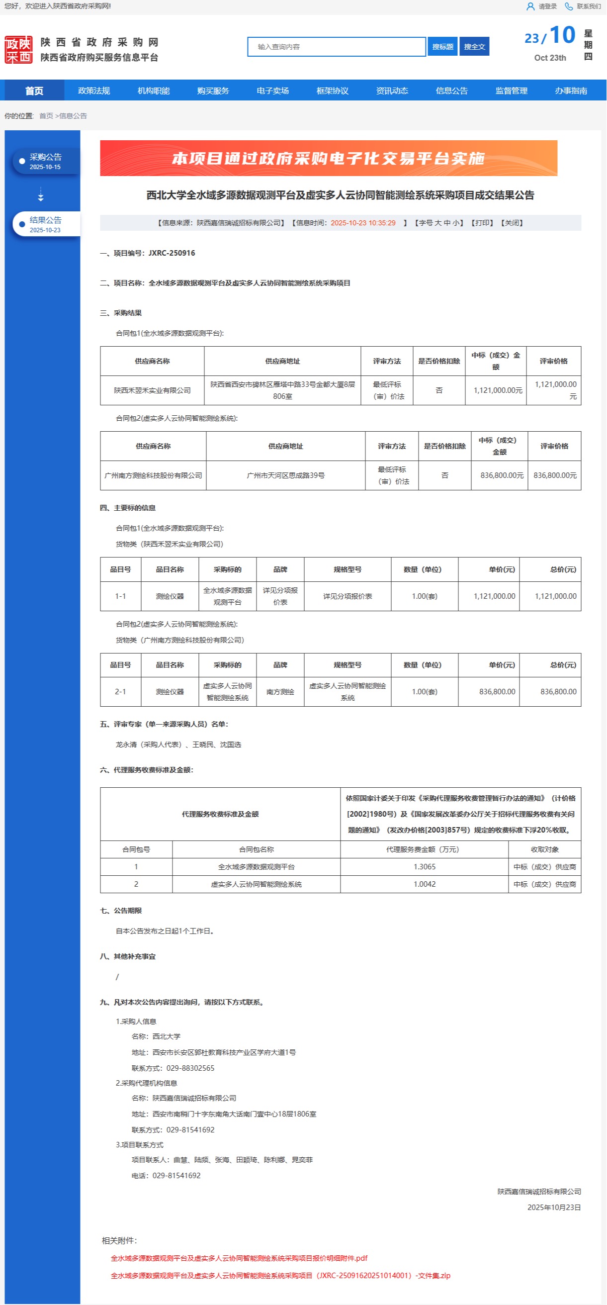 天空(中国)全水域多源数据观测平台及虚实多人云协同智能测绘系统采购项目成交结果公告