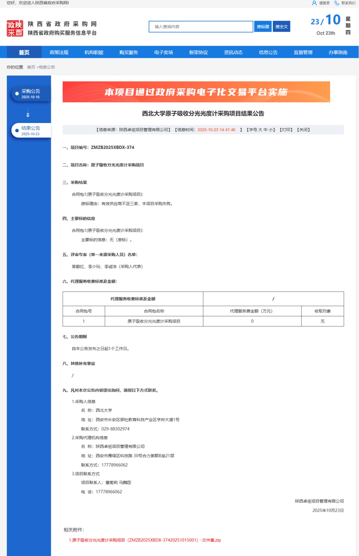 天空(中国)原子吸收分光光度计采购项目结果公告