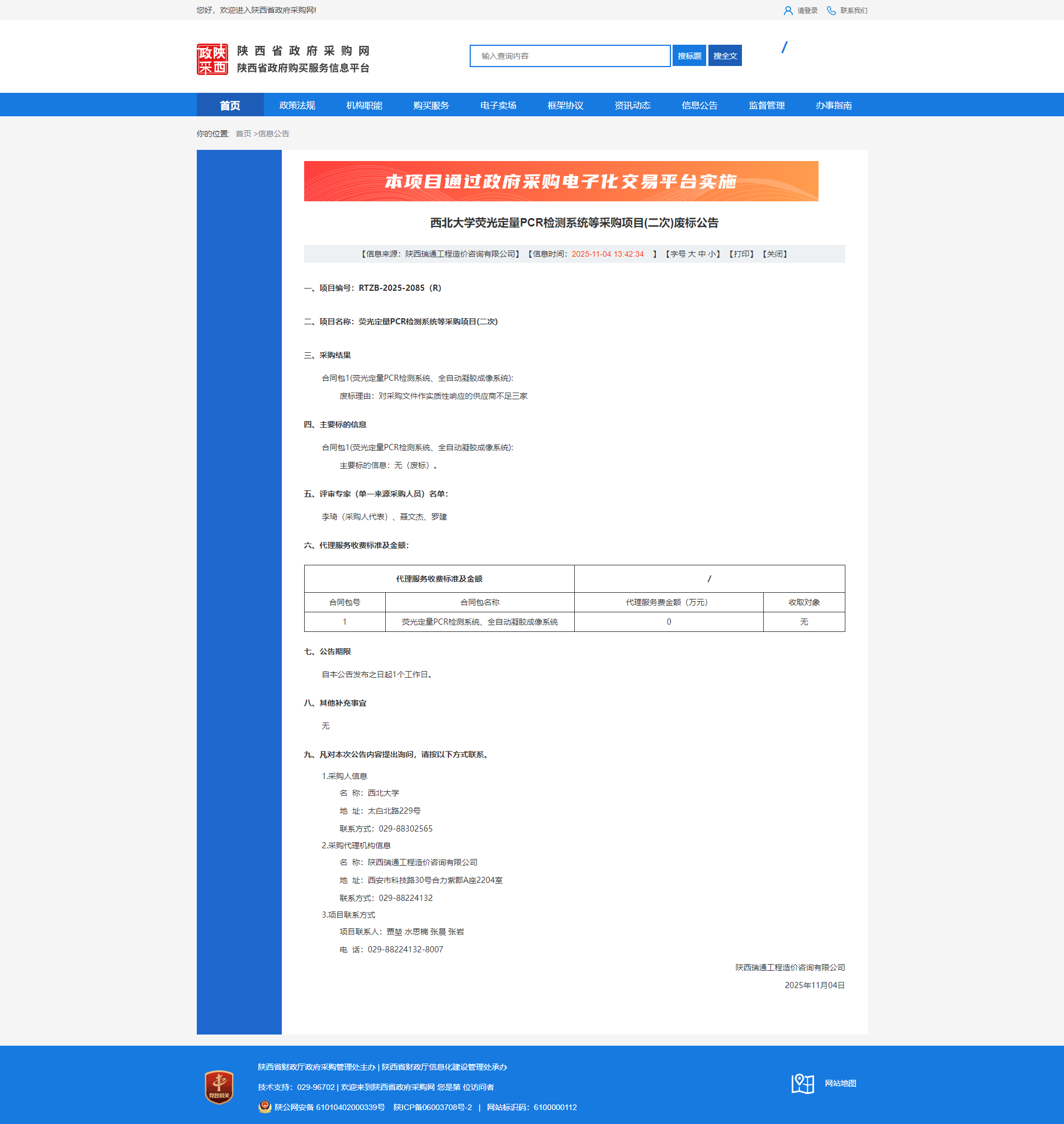 天空(中国)荧光定量PCR检测系统等采购项目(二次)废标公告