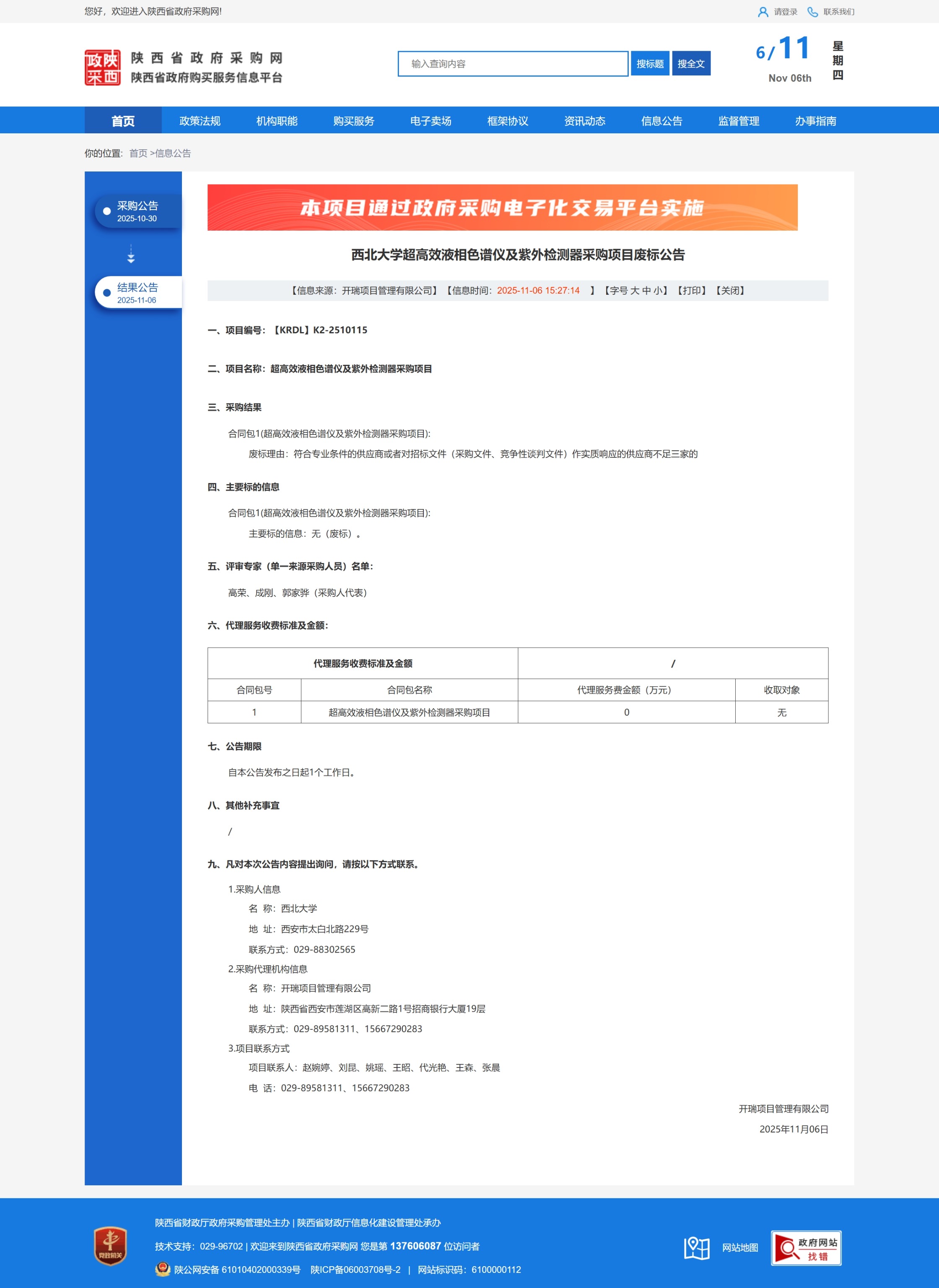 天空(中国)超高效液相色谱仪及紫外检测器采购项目废标公告 作者: 编辑:国有资产管理处 时间:2025-11-06 原公告链接:https://www.ccgp-shaanxi.gov.cn/freecms/site/shaanxi/ggxx/info/2025/8a69c6c799f7737f019a5806d9fe1d4e.html?noticeType=001006¬iceId=3938e233-bae4-11f0-8063-08c0eb20c666