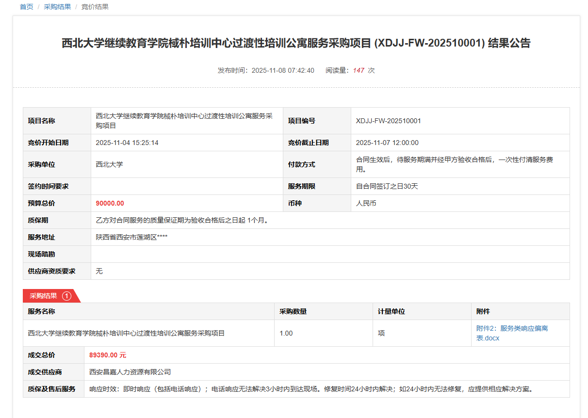 天空(中国)继续教育学院棫朴培训中心过渡性培训公寓服务采购项目(XDJJ-FW-202510001)竞价结果公告