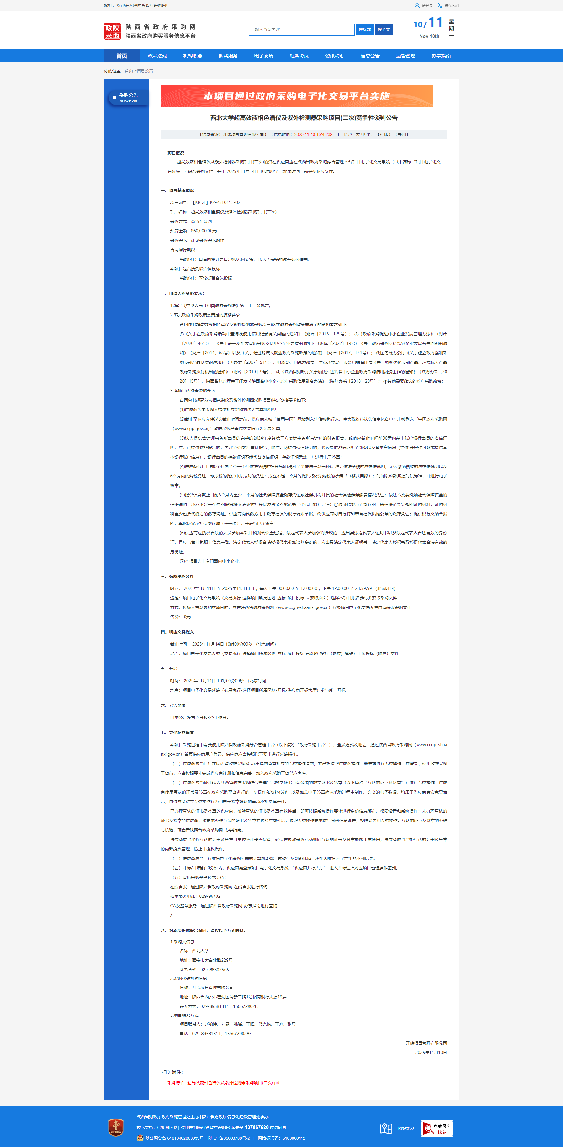 天空(中国)超高效液相色谱仪及紫外检测器采购项目(二次)竞争性谈判公告