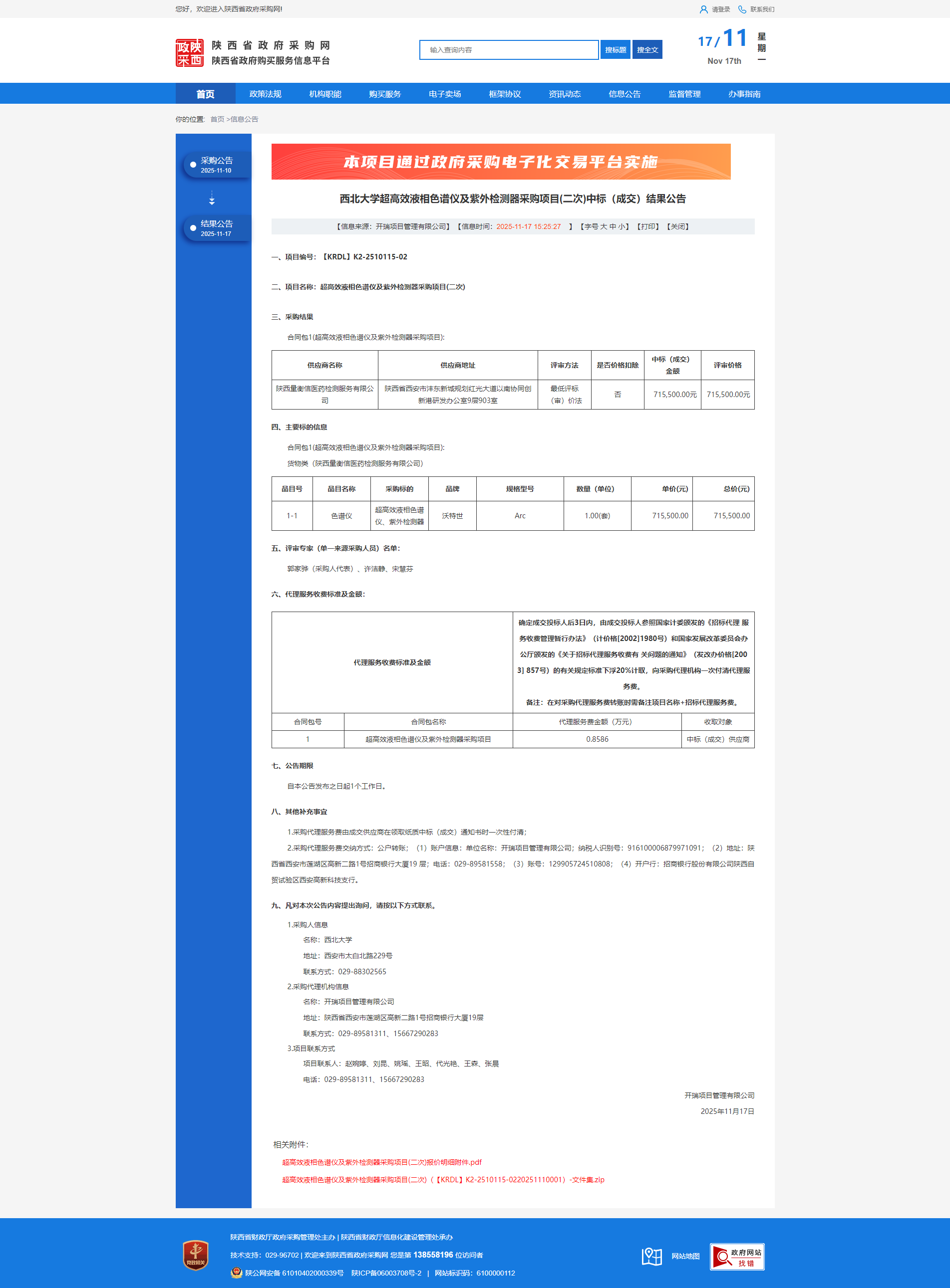 天空(中国)超高效液相色谱仪及紫外检测器采购项目(二次)中标(成交)结果公告