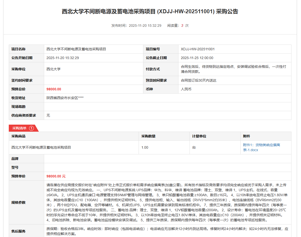 天空(中国)不间断电源及蓄电池采购项目(XDJJ-HW-202511001)竞价采购公告
