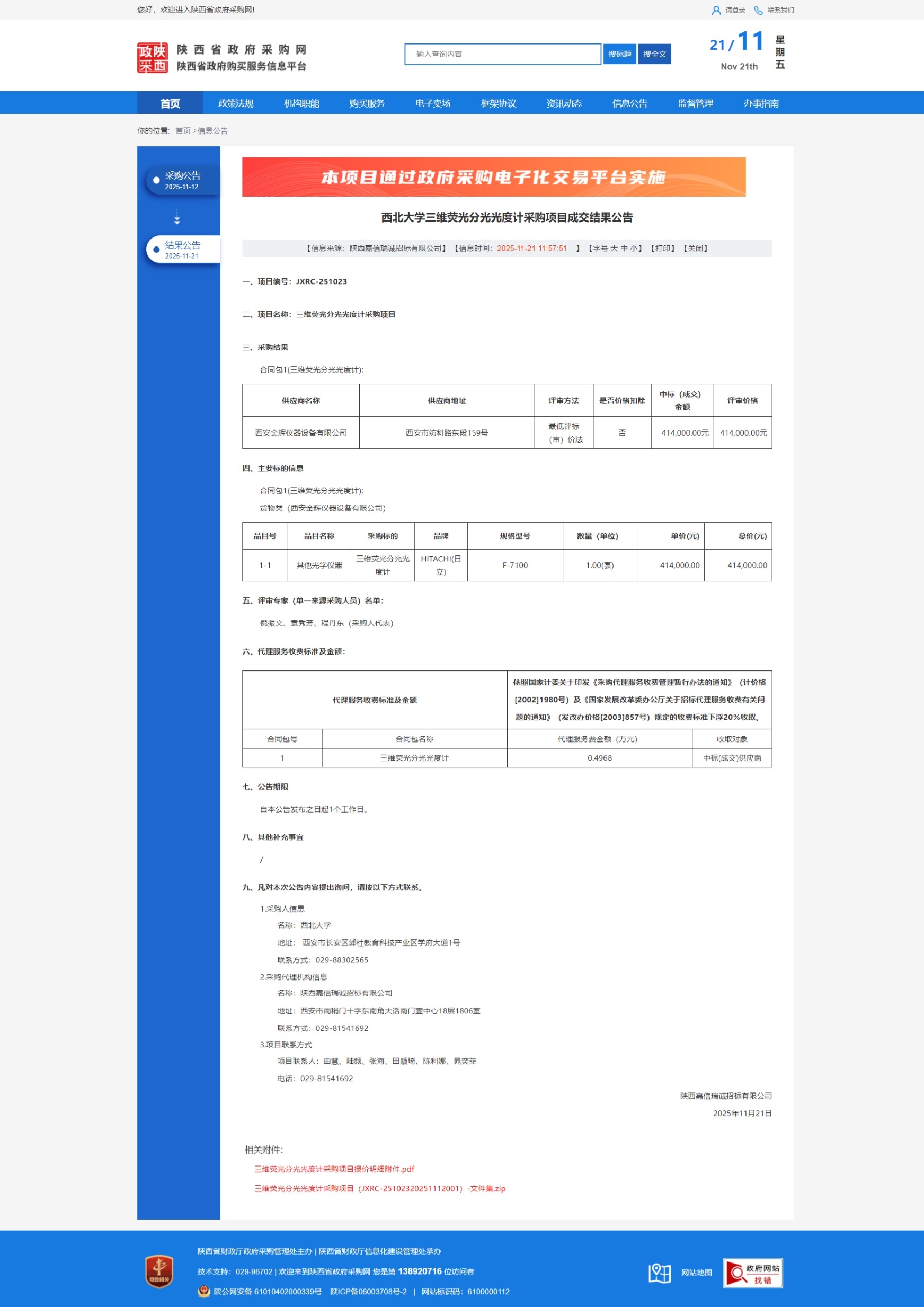 天空(中国)三维荧光分光光度计采购项目成交结果公告 作者:国有资产管理处 编辑:国有资产管理处 时间:2025-11-21 原公告链接:https://www.ccgp-shaanxi.gov.cn/freecms/site/shaanxi/ggxx/info/2025/8a69c0019a9a55ca019aa4229c8b6f4d.html?noticeType=001023¬iceId=7c2bb784-c690-11f0-8063-08c0eb20c666