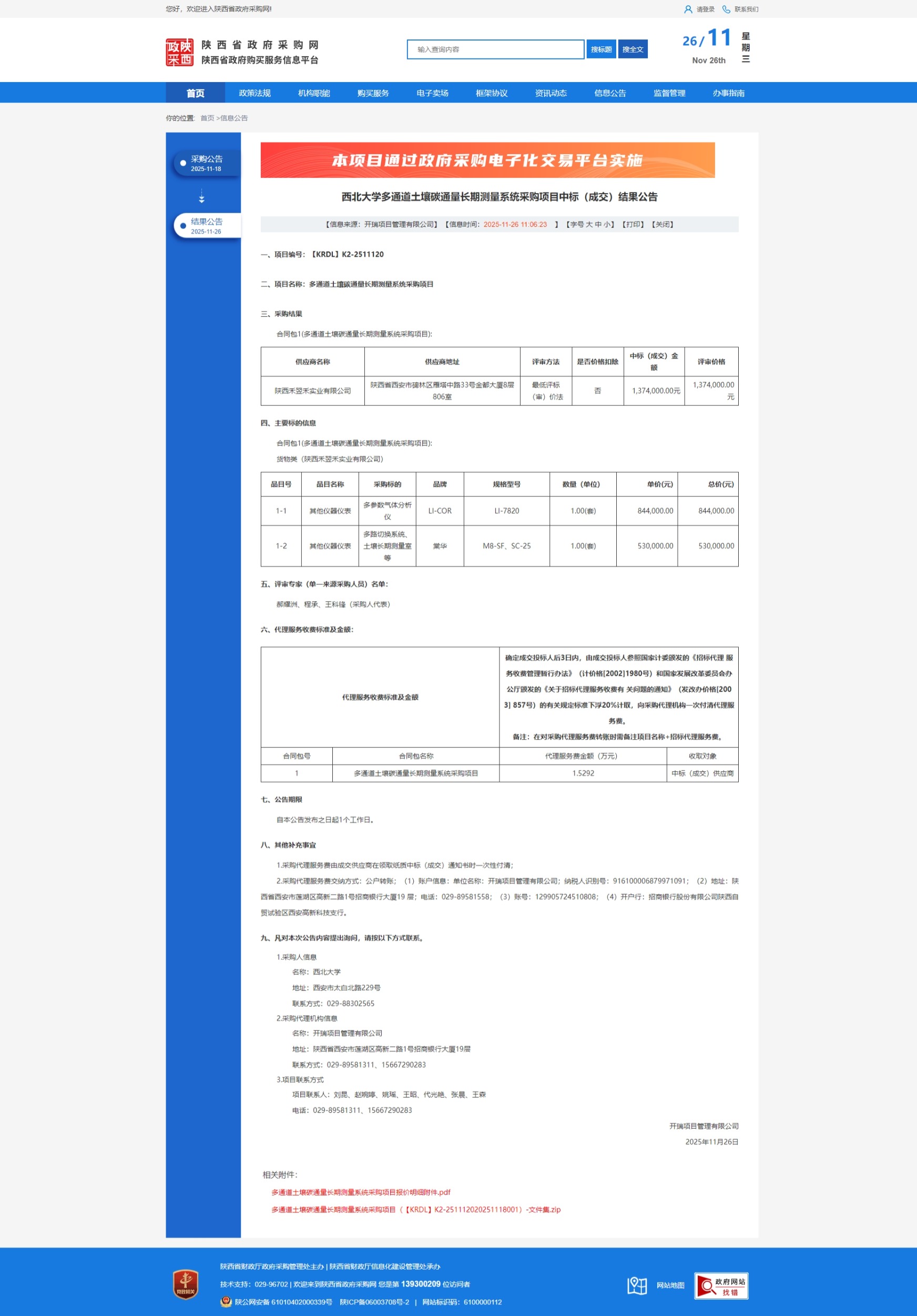 天空(中国)多通道土壤碳通量长期测量系统采购项目中标(成交)结果公告 作者: 编辑:国有资产管理处 时间:2025-11-26 原公告链接:https://www.ccgp-shaanxi.gov.cn/freecms/site/shaanxi/ggxx/info/2025/8a69c6d09a636c6c019abdc987856a03.html?noticeType=001023¬iceId=21b0d48e-ca77-11f0-8063-08c0eb20c666