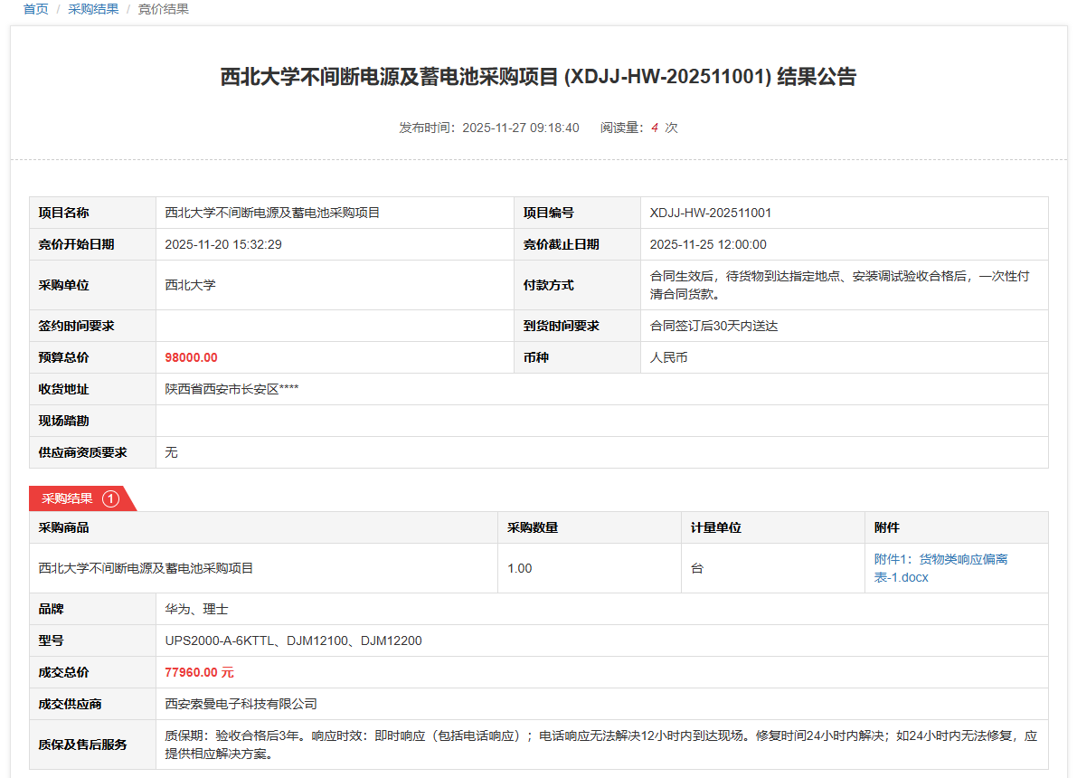 天空(中国)不间断电源及蓄电池采购项目(XDJJ-HW-202511001)竞价结果公告