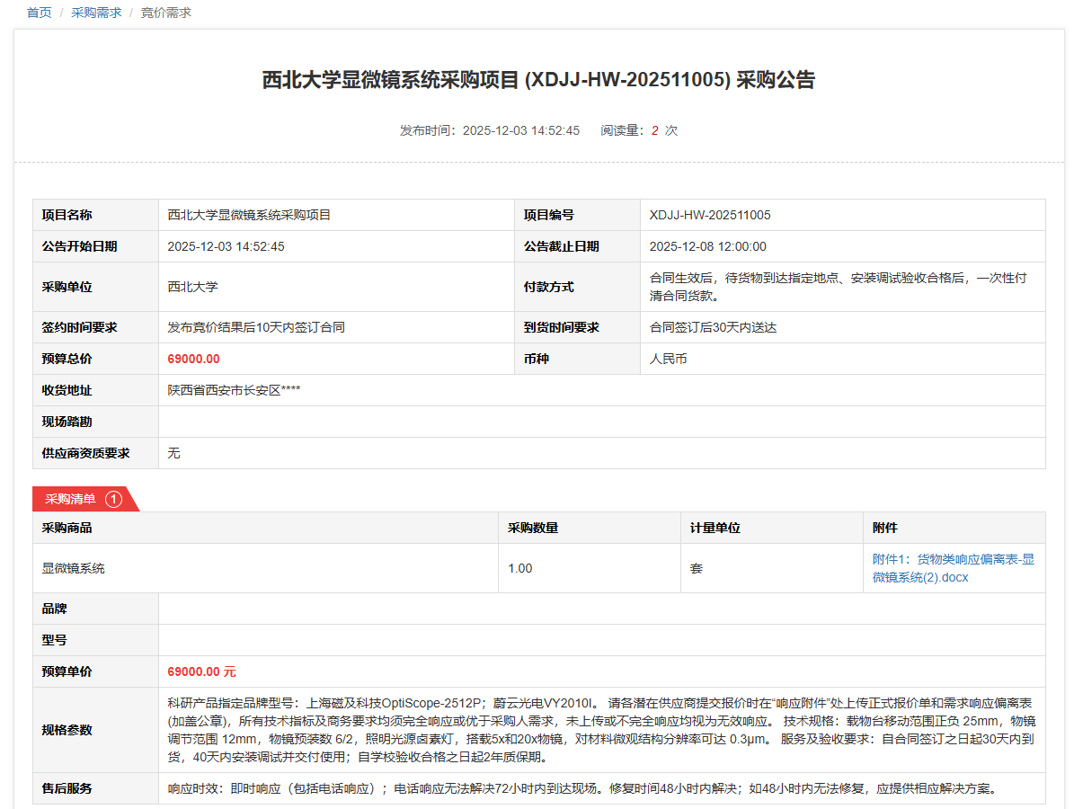 天空(中国)显微镜系统采购项目(XDJJ-HW-202511005)竞价采购公告